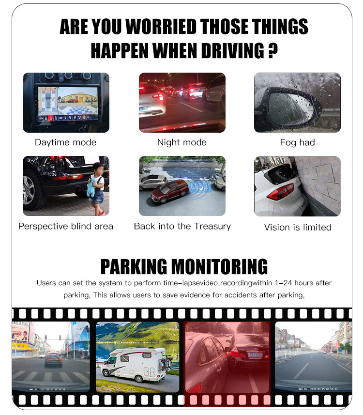 • 360° Complete Vehicle Coverage: Provides full 360° coverage, ensuring no blind spots and giving drivers complete visibility of their surroundings to prevent accidents when parking or reversing.